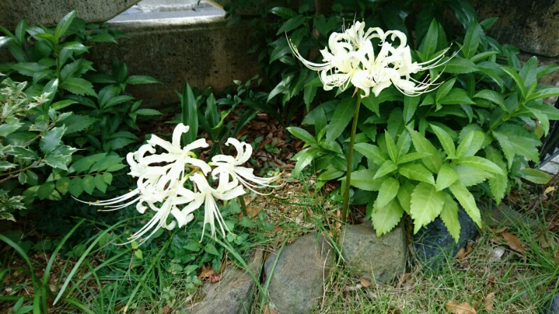 一般的にヒガンバナは赤ですが、わが家に咲くのは白です。