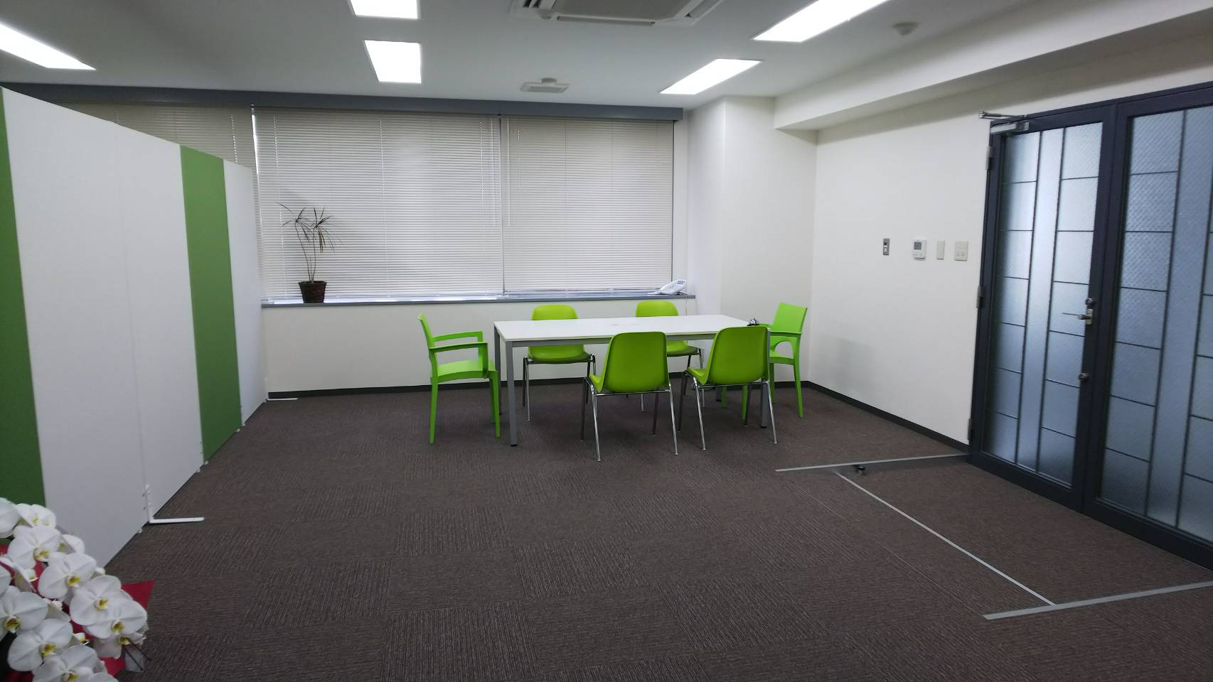 左手の緑と白の壁は社員一同が一生懸命組み立てたパーテーションです。