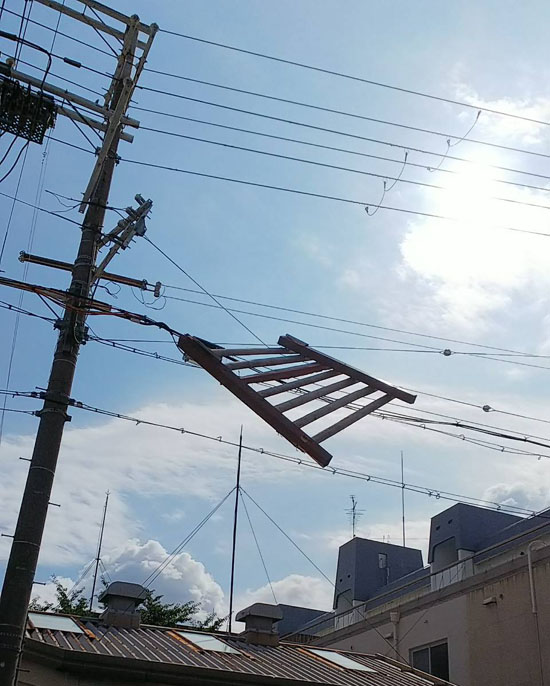 先日の台風で近所の電線に木の柵?のようなものが引っかかっていました。