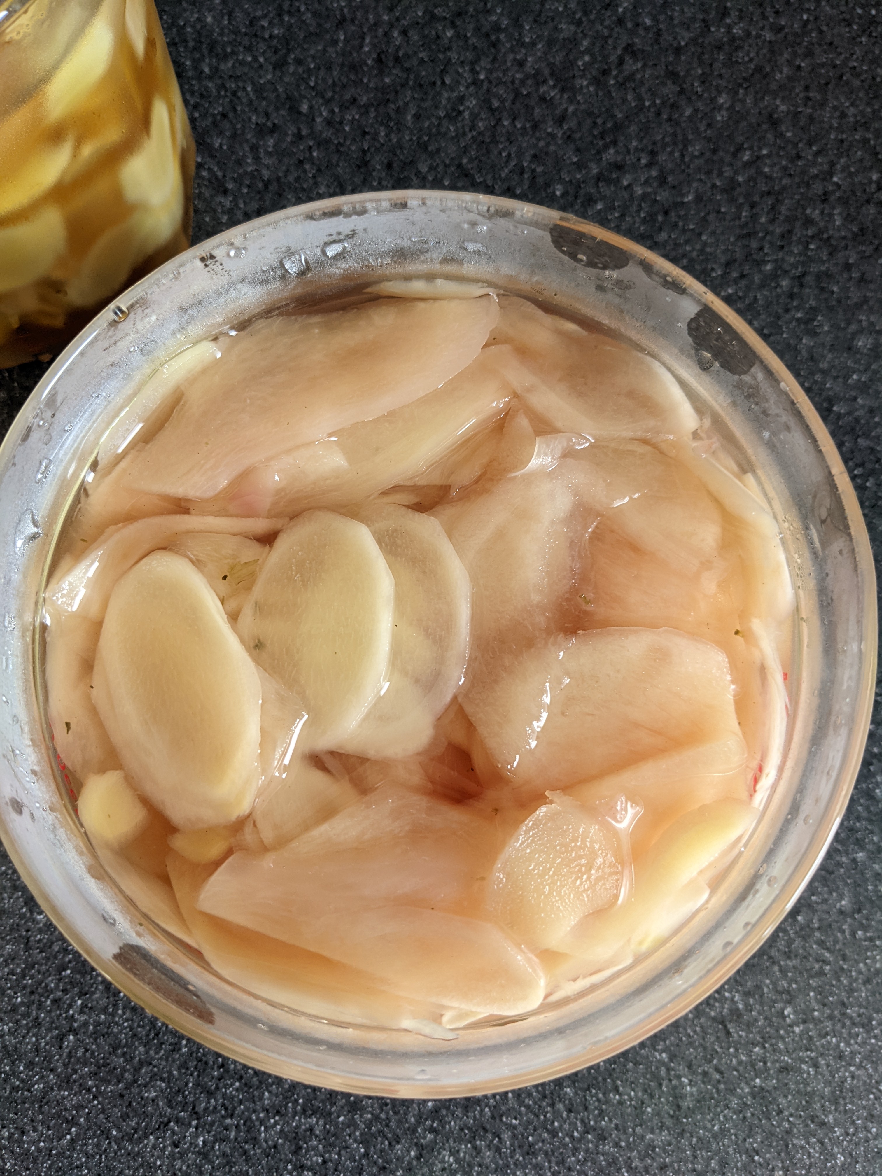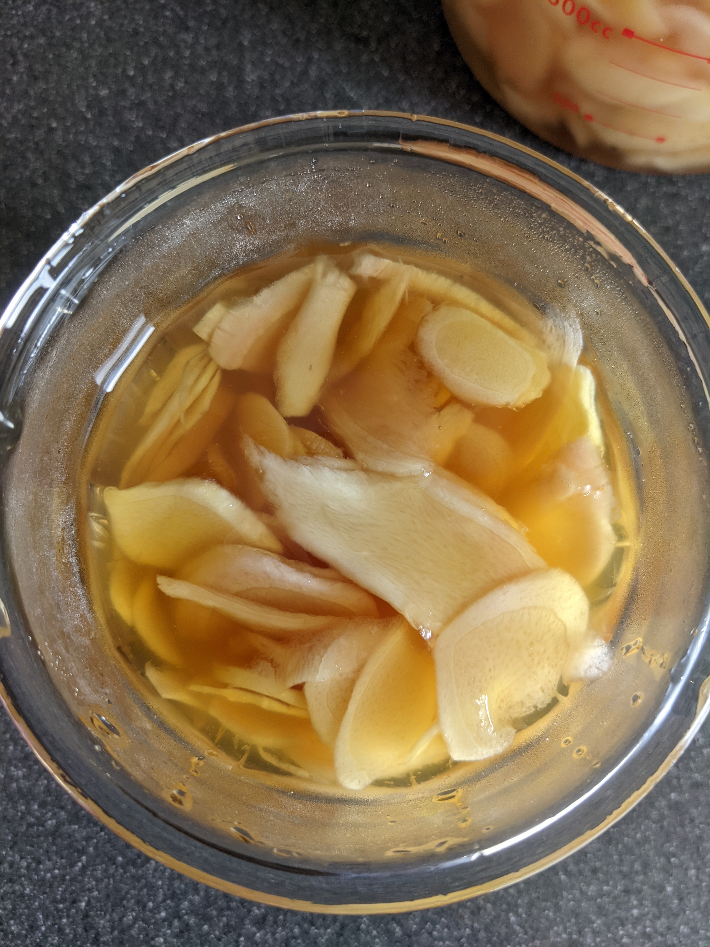 新生姜を軽く洗って(水分はしっかりふき取り、汚れているところはささっと包丁でそぎ落とします)、薄切りにして上からたっぷりはちみつを注ぐだけ。