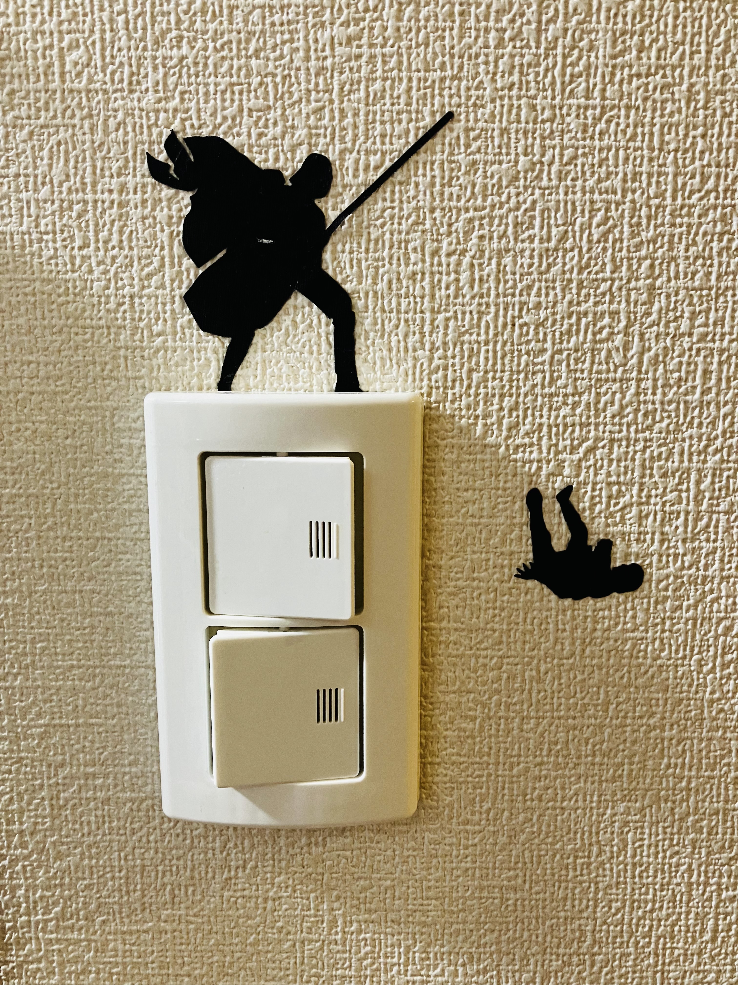 スターウォーズのとある一場面をモチーフにした影絵で、スイッチの枠を床に見立てるというアイデアやシンプルながら分かる人には分かる感じがオシャレっぽくて気に入っています。