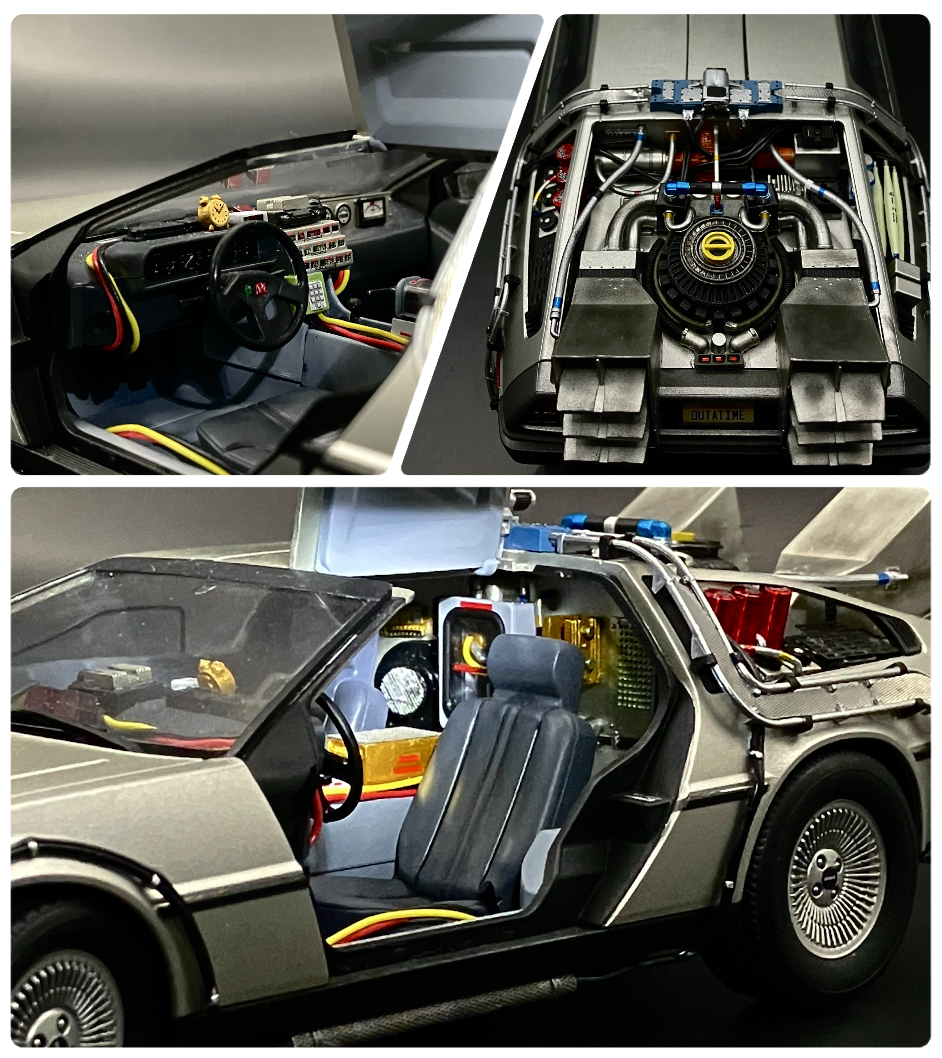 色んな配線や部品がとっ散らかってるのがデロリアンの良さだと思っているのですが、細かいパーツを接着したり塗り分けたりするのが大変すぎました…(結局ほぼ全てのパーツを塗装しました)